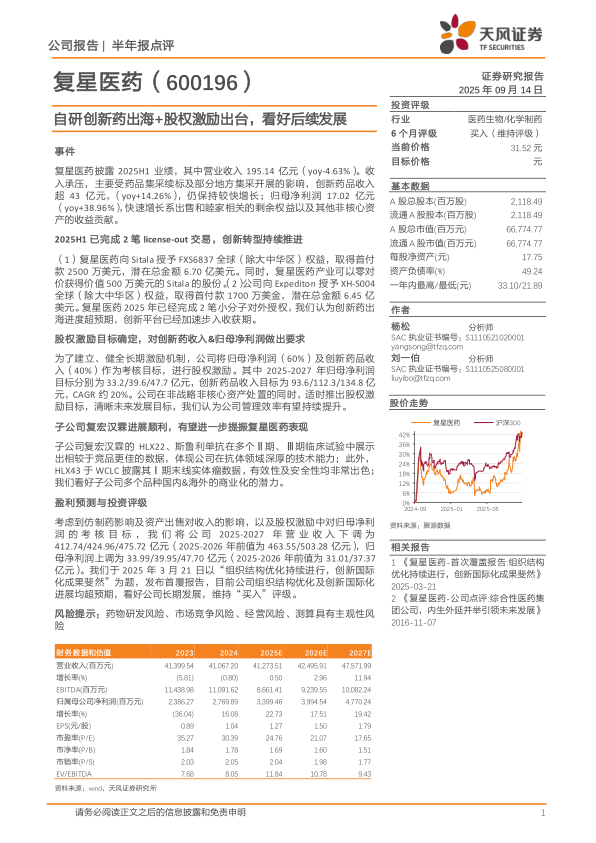 考虑到仿制药影响及资产出售对收入的影响,以及股权激励中对归母净利润的考核目标,我们将公司2025-2027年营业收入下调为412.74/424.96/475.72亿元(2025-2026年前值为463.55/503.28亿元),归母净利润上调为33.99/39.95/47.70亿元(2025-2026年前值为31.01/37.37亿元)。我们于2025年3月21日以“组织结构优化持续进行,创新国际化成果斐然”为题,发布首覆报告,目前公司组织结构优化及创新国际化进展均超预期,看好公司长期发展,维持“买入”评级。