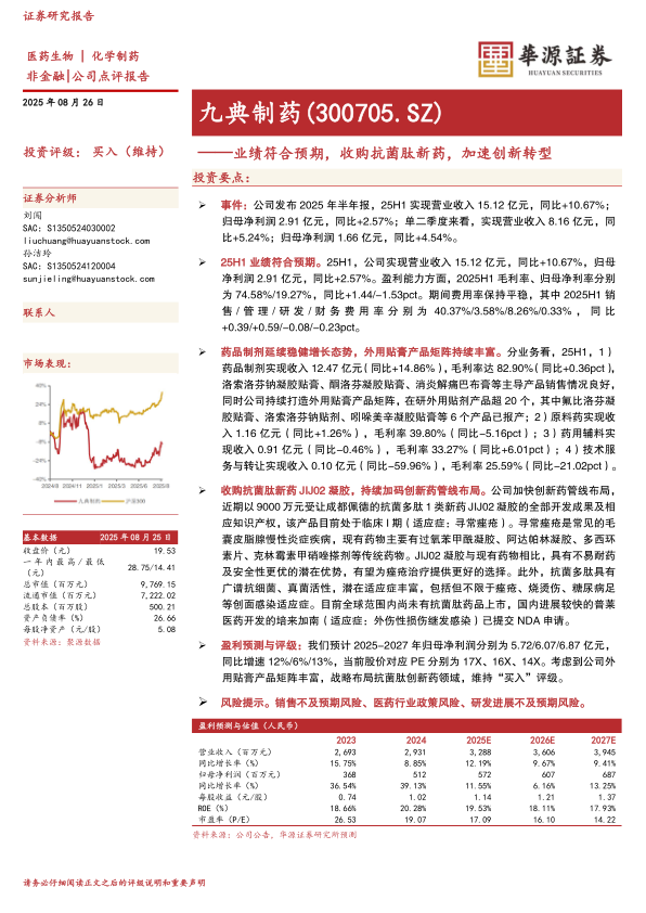九典制药2025年半年度业绩符合预期,药品制剂业务稳健增长,盈利能力保持稳定。公司通过收购抗菌肽新药JIJ02凝胶,加速创新药管线布局,有望在痤疮治疗领域取得突破。维持“买入”评级,但需关注销售不及预期、医药行业政策及研发进展等风险。