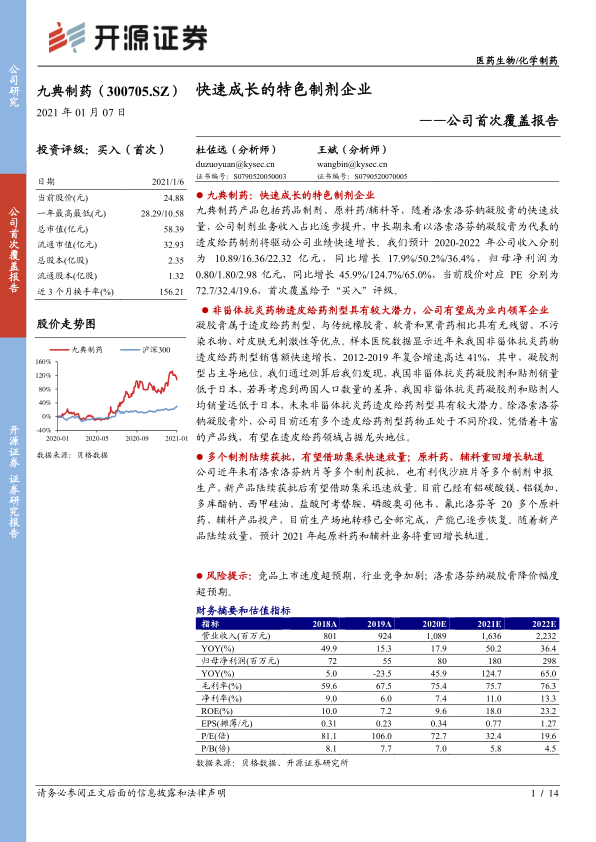 九典制药产品包括药品制剂、原料药/辅料等,随着洛索洛芬钠凝胶膏的快速放量,公司制剂业务收入占比逐步提升,中长期来看以洛索洛芬钠凝胶膏为代表的透皮给药制剂将驱动公司业绩快速增长。我们预计2020-2022年公司收入分别为10.89/16.36/22.32亿元,同比增长17.9%/50.2%/36.4%,归母净利润为0.80/1.80/2.98亿元,同比增长45.9%/124.7%/65.0%,当前股价对应PE分别为72.7/32.4/19.6,首次覆盖给予“买入”评级。