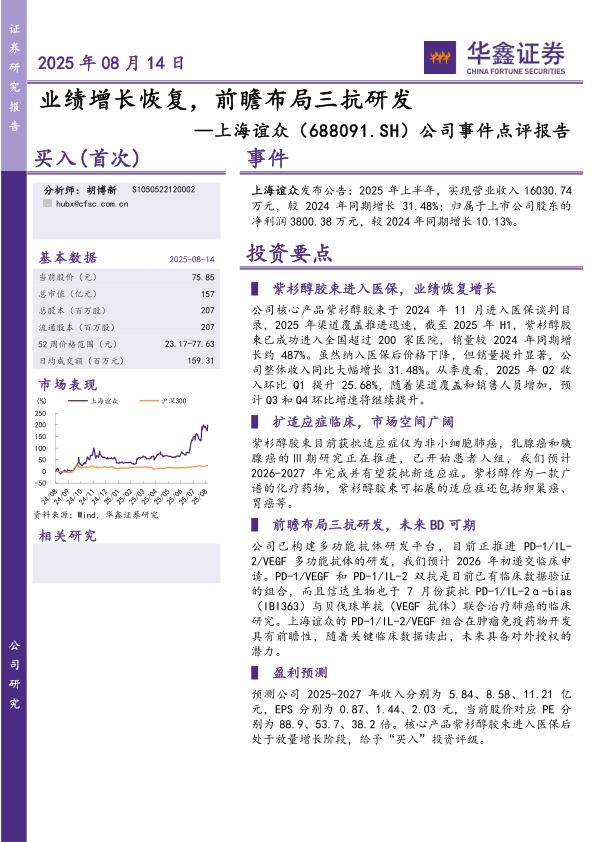 公司已构建多功能抗体研发平台,目前正推进PD-1/IL-2/VEGF多功能抗体的研发,我们预计2026年初递交临床申请。PD-1/VEGF和PD-1/IL-2双抗是目前已有临床数据验证的组合,而且信达生物也于7月份获批PD-1/IL-2α-bias(IBI363)与贝伐珠单抗(VEGF抗体)联合治疗肺癌的临床研究。上海谊众的PD-1/IL-2/VEGF组合在肿瘤免疫药物开发具有前瞻性,随着关键临床数据读出,未来具备对外授权的潜力。