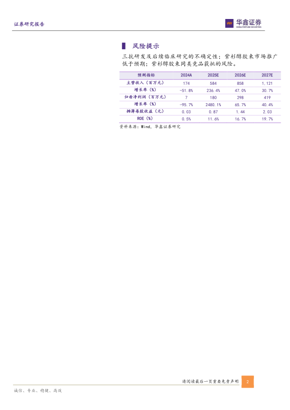 三抗研发及后续临床研究的不确定性;紫杉醇胶束市场推广低于预期;紫杉醇胶束同类竞品获批的风险。