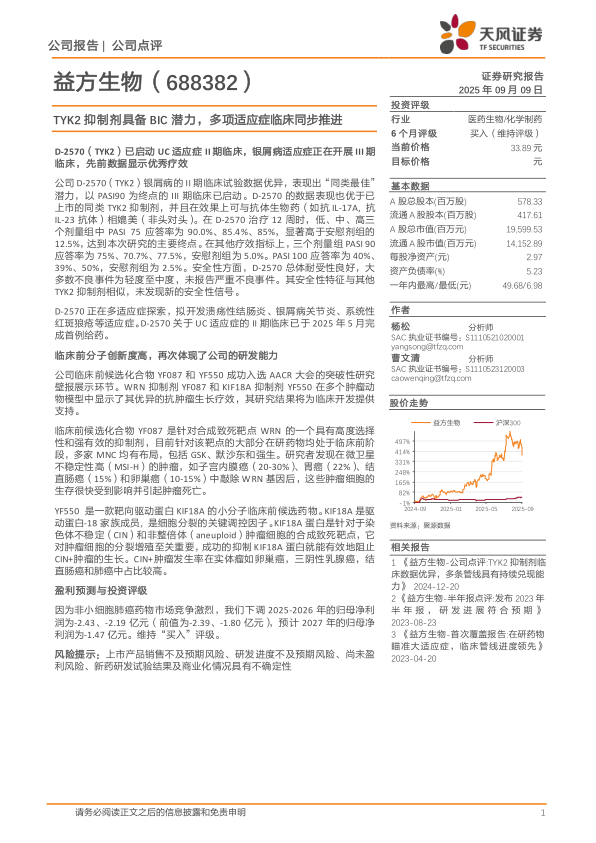 本报告对益方生物的 TYK2 抑制剂 D-2570 的临床进展和潜力进行了分析,认为其具备“同类最佳”潜力,并在银屑病等适应症的临床试验中表现优异。同时,报告也关注了公司临床前候选化合物 YF087 和 YF550 的研究进展,体现了公司在分子创新方面的研发能力。虽然因为市场竞争激烈,报告下调了公司未来的盈利预测,但仍然维持“买入”评级。