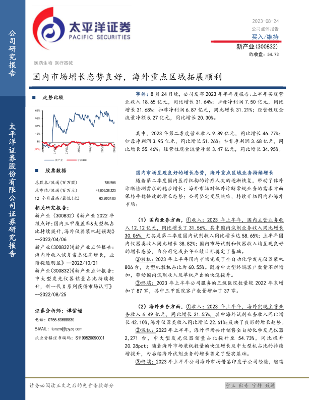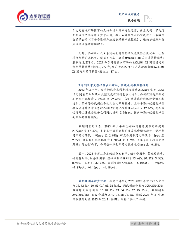 新产业凭借其国内外市场的良好增长态势和产品结构的持续优化,在上半年取得了显著的业绩增长。X系列产品和中大型仪器的销售占比提升,有效提高了公司的盈利能力。虽然面临一定的风险,但公司未来的发展前景依然值得期待,维持“买入”评级。