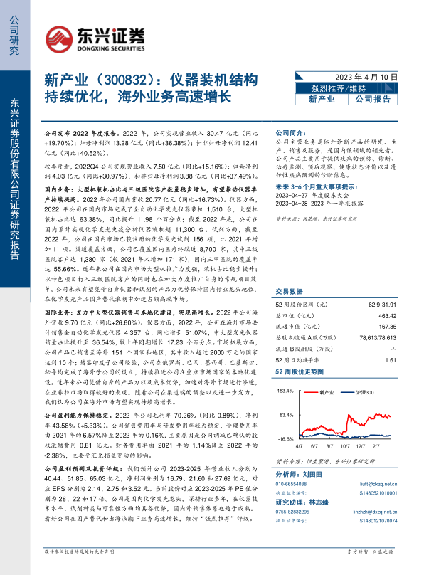公司盈利预测及投资评级:我们预计公司2023-2025年营业收入分别为40.44、51.85、65.03亿元,净利润分别为16.79、21.60和27.69亿元,对应EPS分别为2.14、2.75和3.52元。当前股价对应2023-2025年PE值分别为28、22和17倍。公司是国内化学发光龙头,深耕行业多年,在仪器技术水平、试剂种类与可靠性方面均具备优势,国内外销售体系也趋于成熟。看好公司在国产替代和出海浪潮下业务高速增长,维持“强烈推荐”评级。