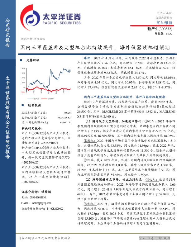 其中,2022年第四季度实现营业收入 7.50 亿元,同比增长 15.16%;归母净利润 4.03 亿元,同比增长 30.97%;扣非净利润 3.88 亿元,同比增长 37.49%;经营性现金流量净额 2.95 亿元,同比下降-8.57%。国内三甲覆盖率&大型机占比提升,海外仪器装机超预期