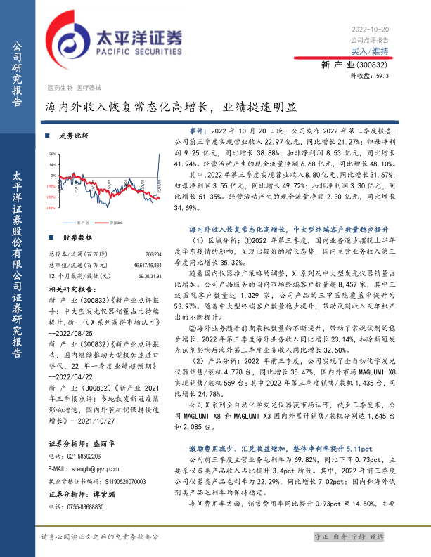新产业公司在2022年第三季度业绩表现出色,海内外收入均恢复常态化高增长,尤其是在国内市场逐步摆脱疫情影响,以及海外市场常规试剂的稳步增长。