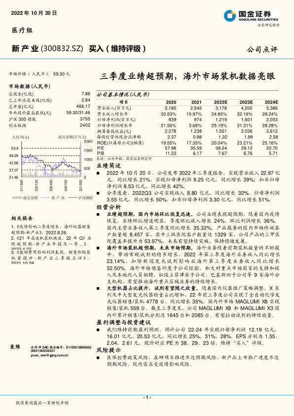 业绩超预期,国内市场环比恢复迅速。 公司业绩表现超预期, 随着国内疫情恢复,业绩环比增速明显,季度环比收入增长 24%, 环比利润增长 36%。国内主营业务收入第三季度同比增长 35.32%。 产品服务的国内市场终端客户数量超 8,457 家,其中三级医院客户数量达 1329 家,公司产品的三甲医院覆盖率提升为 53.97%, 未来有望持续突破, 保持稳健发展。
