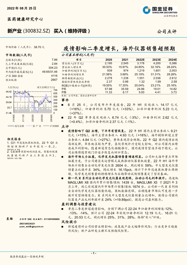 疫情影响下Q2业绩,下半年有望恢复。22年H1国内主营业务收入9.21亿元(+15%),海外主营业务收入4.93亿元(+16%),海外剔除新冠主营业务收入4.84亿元(+27%),整体表现符合预期。22年Q2国内疫情出现局部反弹,华东地区较为严重,医院常规诊疗受较大影响,对公司国内业绩造成不利影响。随着新冠常态化核酸推行,国内疫情有望逐步趋于稳定。公司业绩将随常规门诊逐步恢复而回归常态。