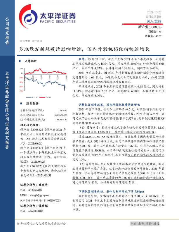 事件:10月27日晚,新产业发布2021年第三季度报告,公司前三季度实现营业收入18.94亿元,同比增长20.60%;归母净利润6.66亿元,同比下降4.67%;扣非净利润6.01亿元,同比下降6.40%。2021年前三季度,因2020年限制性股票激励计划需分摊的股份支付费用为1.69亿元,扣除股份支付和汇兑损益影响后,公司2021年前三季度税后经营性利润同比增长8.18%。