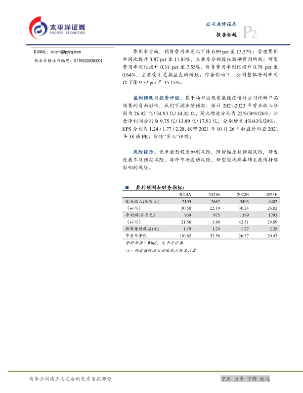 盈利预测与投资评级:基于局部出现聚集性疫情对公司诊断产品销售的负面影响,我们下调业绩预期:预计2021-2023年营业收入分别为26.82亿/34.93亿/44.02亿,同比增速分别为22%/30%/26%;归母净利润分别为9.75亿/13.89亿/17.93亿,分别增长4%/43%/29%;EPS分别为1.24/1.77/2.28,按照2021年10月26日收盘价对应2021年38倍PE。维持“买入”评级。