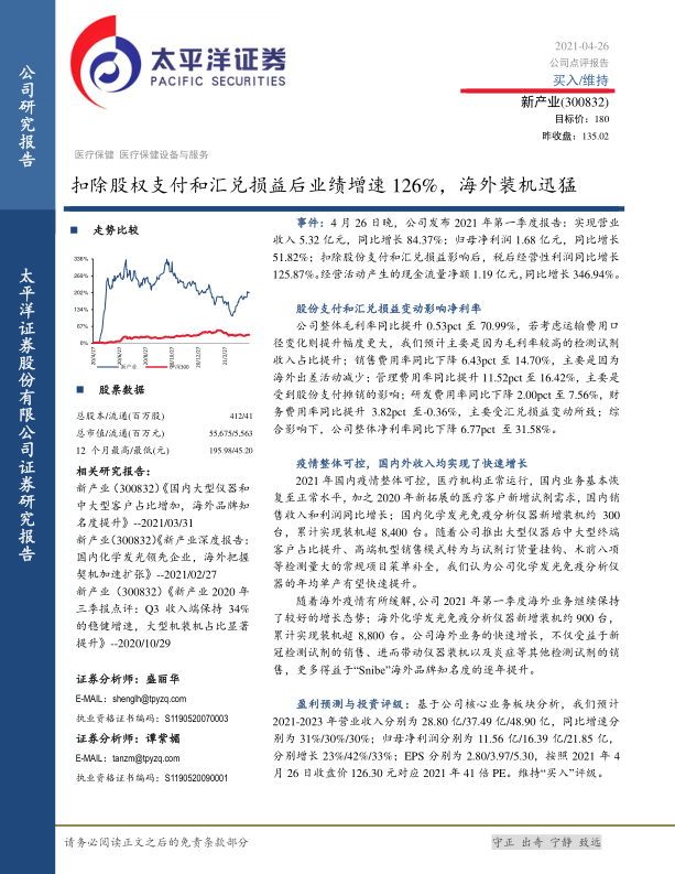 新产业2021年第一季度业绩表现出色,国内外市场均实现快速增长。 太平洋证券维持对公司的“买入”评级,并给出了未来三年的盈利预测。 投资者应关注报告中提示的各项风险,审慎决策。