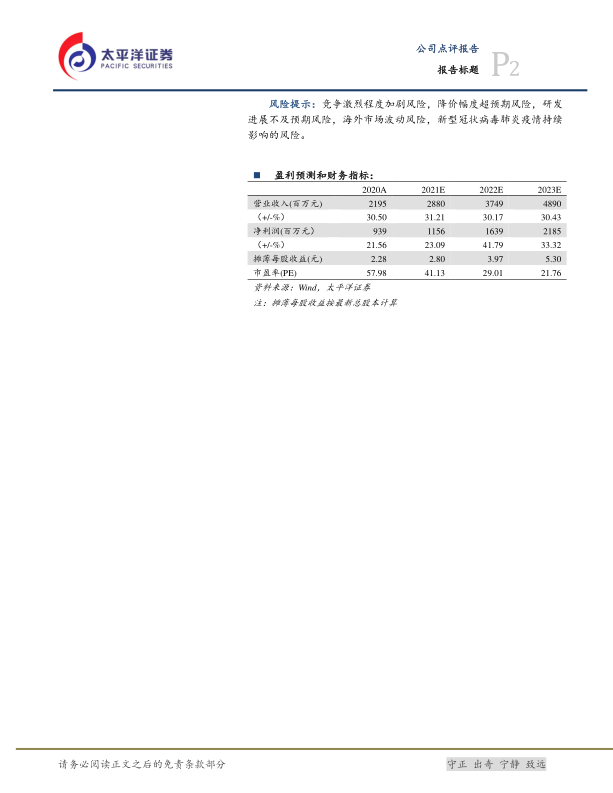风险提示:竞争激烈程度加剧风险,降价幅度超预期风险,研发进展不及预期风险,海外市场波动风险,新型冠状病毒肺炎疫情持续影响的风险。