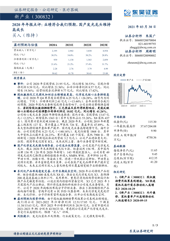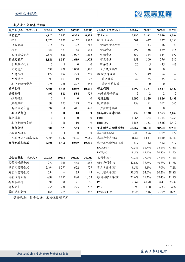 事件:公司 2020 年实现营收 21.95 亿元,同比增长 30.53%;实现归母净利润 9.39 亿元,同比增长 21.56%;扣非归母净利润 8.57 亿元,同比增长 19.36%;经营性现金流净额 9.77 亿元,同比增长 17.42%。