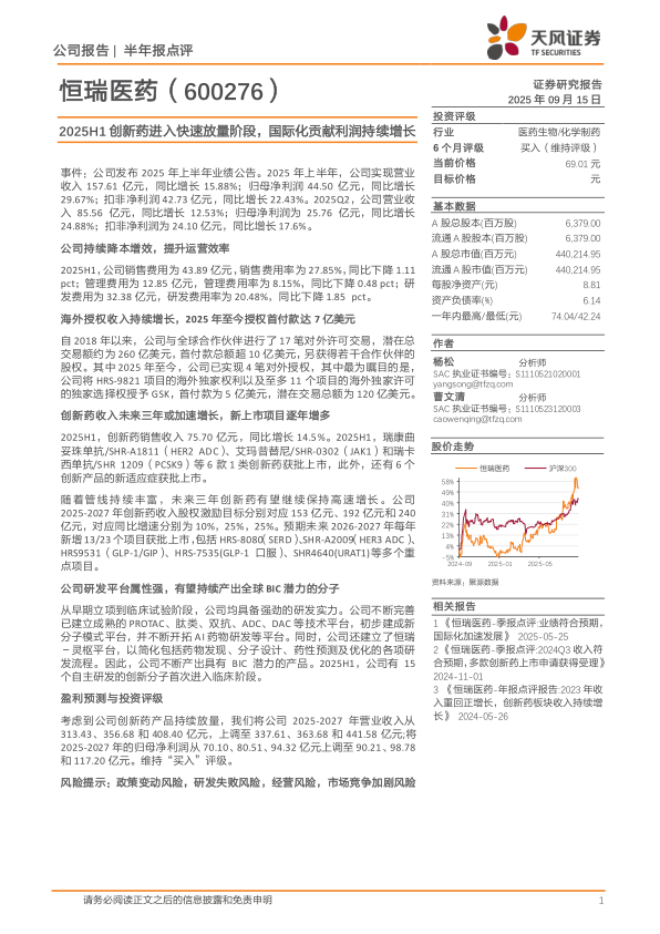 考虑到公司创新药产品持续放量,我们将公司2025-2027年营业收入从313.43、356.68和408.40亿元,上调至337.61、363.68和441.58亿元;将2025-2027年的归母净利润从70.10、80.51、94.32亿元上调至90.21、98.78和117.20亿元。维持“买入”评级。