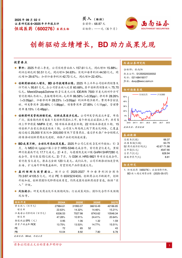 本报告对恒瑞医药2025年半年报进行了全面分析,指出公司在创新药驱动和BD合作的推动下,业绩实现稳健增长。公司研发管线丰富,创新成果逐步兑现,全球化布局不断深入。维持“买入”评级,并对公司未来发展前景持乐观态度。
