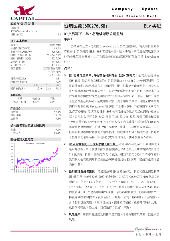 BD交易再添新单,将收获首付款现金3250万美元:公司此次授权的HRS-1893是公司自主研发的心肌肌球蛋白(Myosin)小分子抑制剂,可特异性抑制心肌肌球蛋白ATP酶活性,使心肌收缩性能正常化,减少左心室肥厚并改善舒张期顺应性,主要治疗肥厚性心肌病。截止上半年末,该产品针对梗阻性肥厚型心肌病在中国的临床试验已处于临床三期中,非梗阻性肥厚型心肌病适应症的临床试验已处于临床二期中。目前全球同类的药物仅有BMS的Mavacamten在2022年上市,2024年销售额为6.0亿美元(YOY+161%),可以预见HRS-1893未来可成长为亿美元级的药物。根据协议,公司此次将可收到6500万美元首付款(含3250万美元现金和等值3250万美元的Braveheart Bio公司股权)和完成技术转移后的1000万美元近期里程碑款,总计7500万美元。此外,公司还可收到最高10.13亿美元的里程碑付款及海外销售提成,通过此种NewCo模式交易,将有助于提升公司创新品牌,实现研发成果快速转化,快速覆盖海外市场。