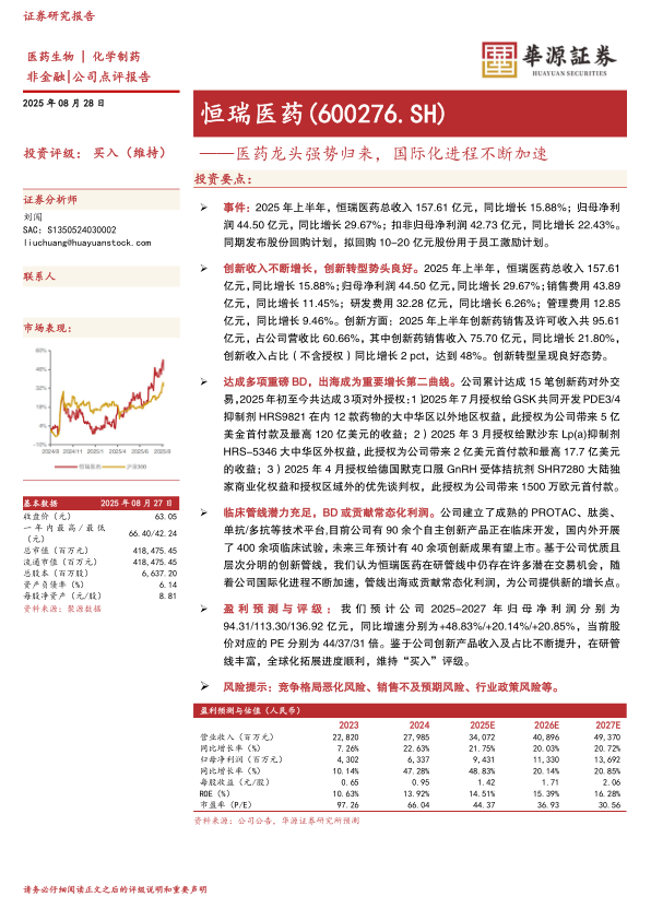 盈利预测与评级:我们预计公司2025-2027年归母净利润分别为94.31/113.30/136.92亿元,同比增速分别为+48.83%/+20.14%/+20.85%,当前股价对应的PE分别为44/37/31倍。鉴于公司创新产品收入及占比不断提升,在研管线丰富,全球化拓展进度顺利,维持“买入”评级。