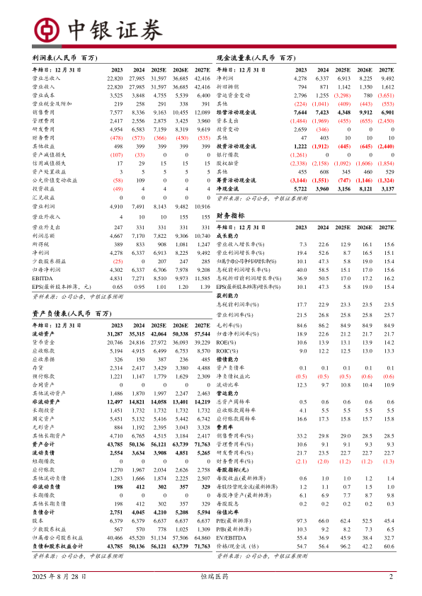 公司上半年进行再融资,导致股本/财务费用发生一定变化,基于此,我们预测公司25-27年归母净利润为67.06/79.78/92.08亿元(原预测为67.04/79.75/92.04亿元),对应EPS分别为1.01/1.20/1.39元,截止到27日收盘,股价对应PE为62.4/52.5/45.4x,公司创新产品逐步成为公司重要增长引擎,且创新进展及全球化布局持续推进,我们看好公司未来的发展机会,维持买入评级。