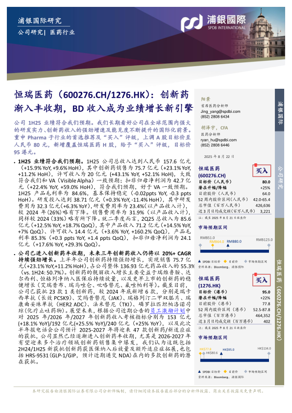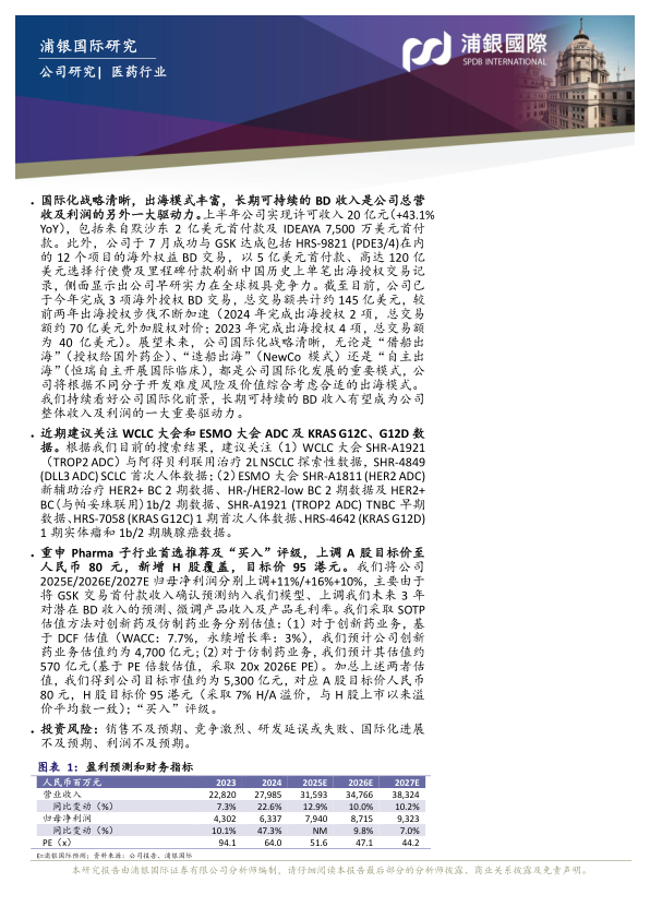 公司1H25业绩符合我们预期。我们长期看好公司在全球范围内强大的研发实力、创新药收入的强劲增速及能见度不断提升的国际化前景。重申Pharma子行业的首选推荐及“买入”评级,上调A股目标价至人民币80元,新增覆盖恒瑞医药H股,给予“买入”评级,目标价95港元。