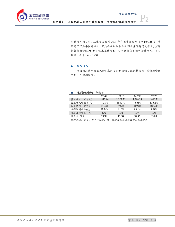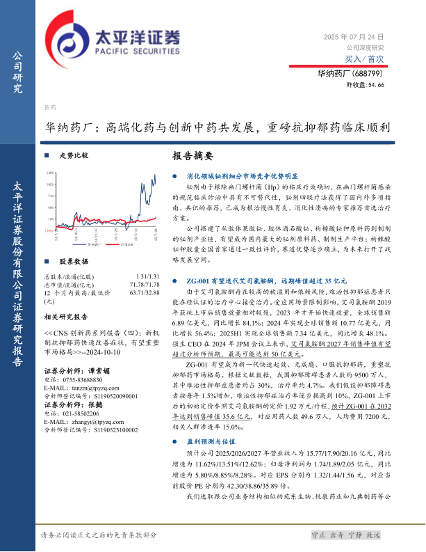 华纳药厂凭借在消化领域铋剂市场的优势地位,以及原料制剂一体化的产业链优势,实现了业绩的稳健增长。公司积极布局创新药领域,尤其是抗抑郁药 ZG-001 的临床推进,有望为公司带来新的增长点。综合考虑公司稳健的业务基础和创新药的潜力,首次覆盖,给予“买入”评级。同时,需要关注药品集采、目录调整以及创新药研发等风险。