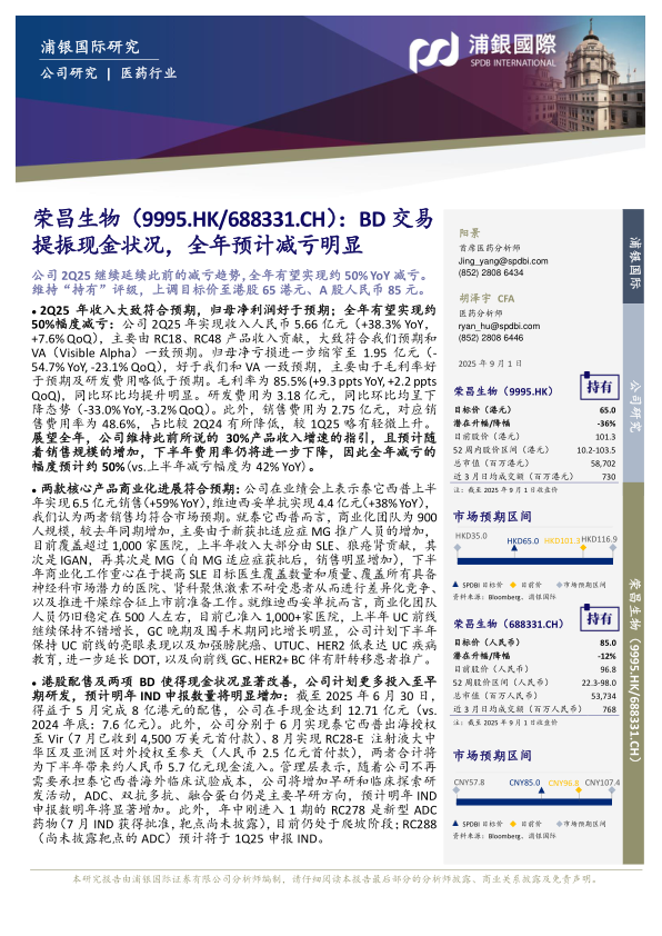 公司2Q25继续延续此前的减亏趋势,全年有望实现约50%YoY减亏。维持“持有”评级,上调目标价至港股65港元、A股人民币85元。