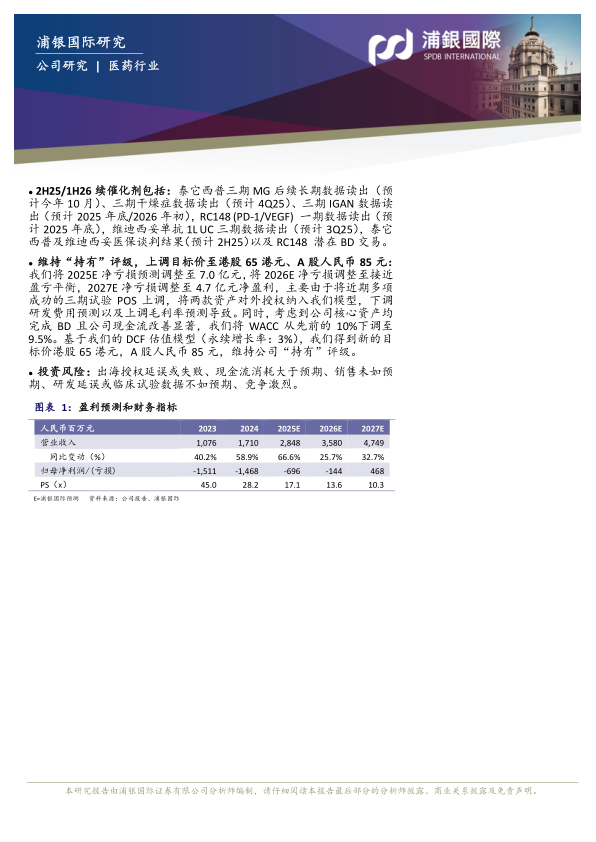 维持“持有”评级,上调目标价至港股65港元、A股人民币85元:我们将2025E净亏损预测调整至7.0亿元,将2026E净亏损调整至接近盈亏平衡,2027E净亏损调整至4.7亿元净盈利,主要由于将近期多项成功的三期试验POS上调,将两款资产对外授权纳入我们模型,下调研发费用预测以及上调毛利率预测导致。同时,考虑到公司核心资产均完成BD且公司现金流改善显著,我们将WACC从先前的10%下调至9.5%。基于我们的DCF估值模型(永续增长率:3%),我们得到新的目标价港股65港元,A股人民币85元,维持公司“持有”评级。