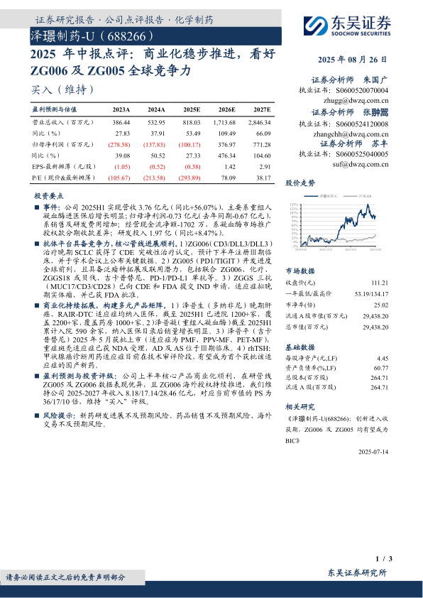 盈利预测与投资评级:公司上半年核心产品商业化顺利,在研管线ZG005及ZG006数据表现优异,且ZG006海外授权持续推进,我们维持公司2025-2027年收入8.18/17.14/28.46亿元,对应当前市值的PS为36/17/10倍,维持“买入”评级。