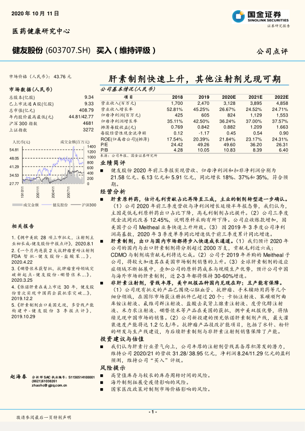 健友股份正处于从肝素原料药向高毛利制剂转型的关键阶段,制剂业务的快速增长是公司业绩增长的主要驱动力。肝素制剂受益于适应症拓展和成本优势,在国内外市场均具备巨大潜力。同时,公司拥有的丰富非肝素注射剂管线和中美双报优势,为未来的业绩增长提供了保障。维持“买入”评级,但需关注高货值库存、海外疫情和医改政策等风险。