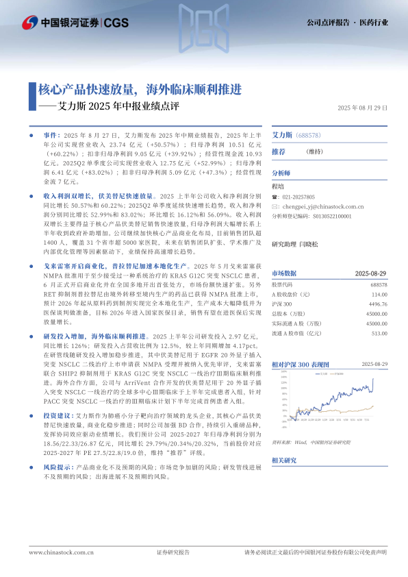 艾力斯2025年中报业绩点评:核心产品快速放量,海外临床顺利推进