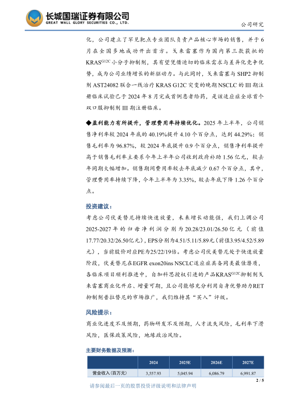考虑公司伏美替尼持续快速放量,未来增长动能强,我们上调公司2025-2027年的归母净利润分别为20.28/23.01/26.50亿元(前值17.77/20.32/26.50亿元),EPS分别为4.51/5.11/5.89元(前值3.95/4.52/5.89元),当前股价对应PE为25/22/19倍。考虑公司伏美替尼处于快速放量阶段,伏美替尼在EGFR exon20ins NSCLC适应症具备同类最佳潜质,各临床项目顺利推进中,自加科思授权引进的产品KRASG12C抑制剂戈来雷塞商业化开启、增量可期,且公司能够充分利用自身优势助力RET抑制剂普拉替尼的市场推广,我们维持其“买入”评级。