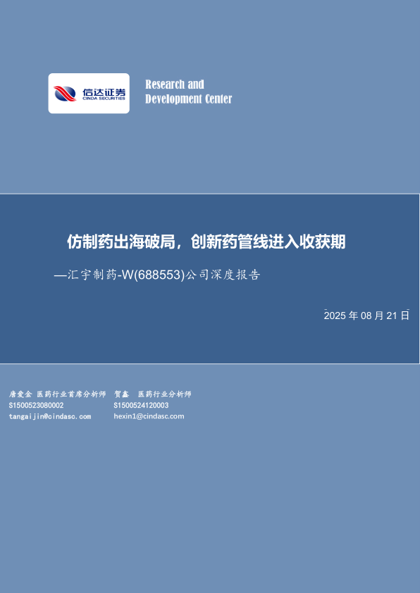 公司深度报告:仿制药出海破局,创新药管线进入收获期