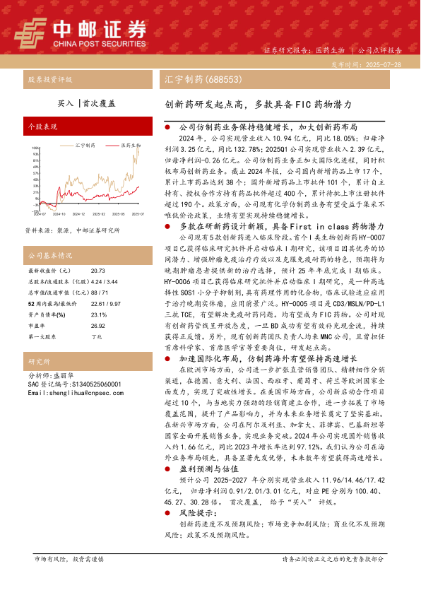 汇宇制药在仿制药业务稳健增长的基础上,积极布局创新药研发,尤其是在First-in-Class(FIC)药物方面具有潜力。公司加速国际化布局,仿制药海外市场有望保持高速增长,尤其是在欧洲、美国和新兴市场。预计公司未来几年营收和利润将保持增长,首次覆盖给予“买入”评级,但同时也需关注创新药研发进度、市场竞争、商业化以及政策等风险。