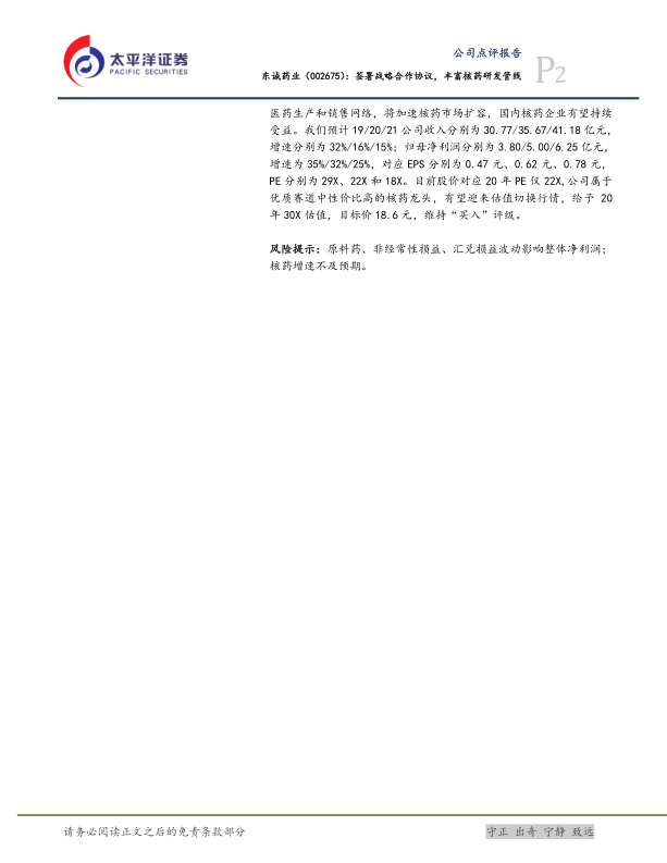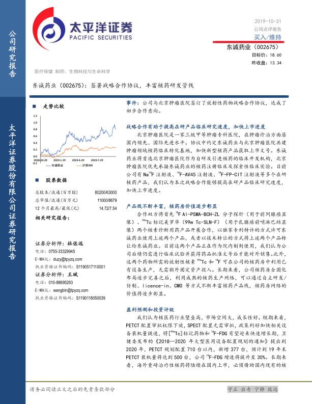 # 中心思想 * **战略合作加速核药研发与上市** * 东诚药业与北京肿瘤医院的战略合作,旨在共建肿瘤领域核药临床转化基地,加速新型核药产品的上市进程。 * **核药房价值逐步彰显** * 通过自主研发、合作引进等方式,不断丰富核药产品线,提升核药房网络的价值。 # 主要内容 * **事件:公司与北京肿瘤医院签订战略合作协议** * 东诚药业与北京肿瘤医院达成初步合作意向,共同建设肿瘤领域核药临床转化基地,加速新型核药产品获取上市文号。 * **产品线不断丰富,核药房价值逐步彰显** * 合作双方将首先就18F Al-PSMA-BCH-ZL 分子探针和99mTc标记美罗华两个核素诊断用药产品开展合作。 * 公司后续仍需进行临床试验并获得药品批准文号后才能对外销售。 * 这两个药物所需的放射性核素可在公司的核药房中利用已有设备生产,无需额外固定资产投入。 * 公司核药房全国化布局逐步完善之后,可以通过自主研发/仿制、licence-in、CMO 等方式不断丰富核药产品线,核药房网络的价值将逐步彰显。 * **盈利预测和投资评级** * 预计公司19/20/21年收入分别为30.77/35.67/41.18亿元,增速分别为32%/16%/15%;归母净利润分别为3.80/5.00/6.25亿元,增速为35%/32%/25%,对应EPS分别为0.47元、0.62元、0.78元,PE分别为29X、22X和18X。 * 目前股价对应20年PE仅22X,公司属于优质赛道中性价比高的核药龙头,有望迎来估值切换行情,给予20年30X估值,目标价18.6元,维持“买入”评级。 # 总结 * **战略合作与产品线扩张** * 东诚药业通过与北京肿瘤医院的战略合作,加速核药研发和上市进程,并不断丰富产品线,提升核药房网络的价值。 * **盈利预测与投资评级** * 维持“买入”评级,目标价18.6元,看好公司未来发展。