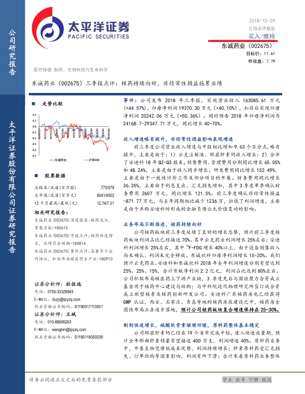 三季报点评:核药持续向好,非经常性损益拖累业绩