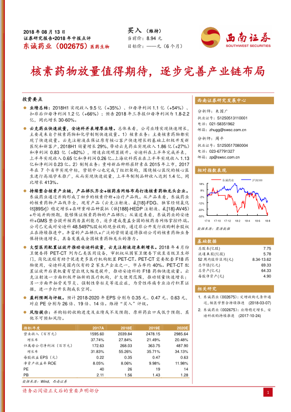 2018年中报点评:核素药物放量值得期待,逐步完善产业链布局