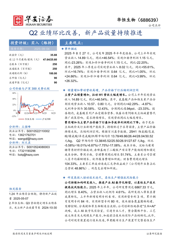 本报告分析了华恒生物2025年半年度报告,指出公司二季度业绩环比改善,营收增长主要受益于氨基酸产品需求增加,但产品价格下跌和成本费用增加压缩了利润空间。公司通过加大研发投入、推进柔性生产和完善产能布局来增强竞争力。维持“买入”评级,但需关注项目投产进度、审批进度、产品价格和原材料成本等风险。