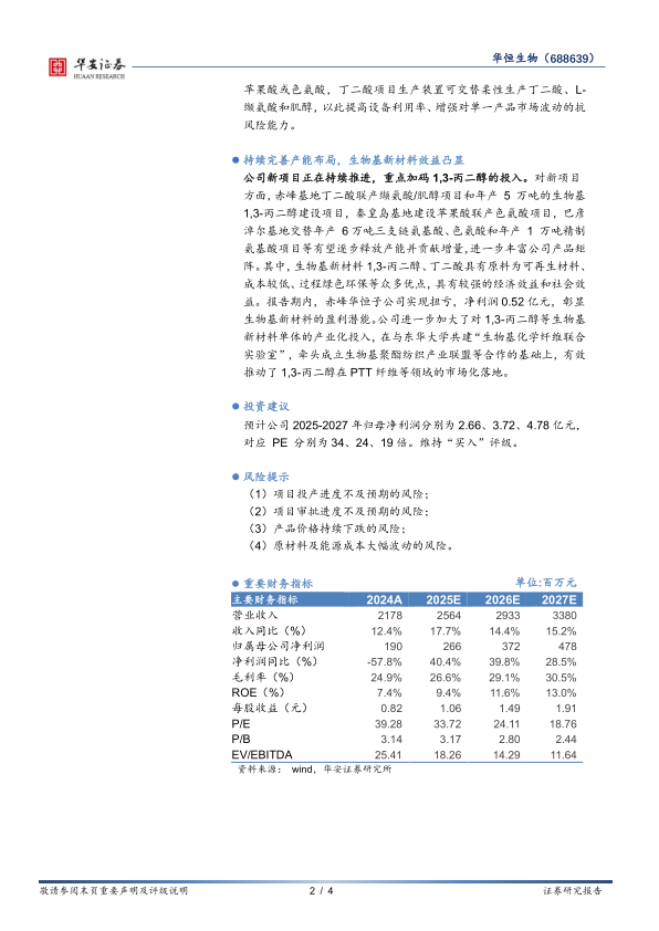 公司新项目正在持续推进,重点加码1,3-丙二醇的投入。对新项目方面,赤峰基地丁二酸联产缬氨酸/肌醇项目和年产5万吨的生物基1,3-丙二醇建设项目,秦皇岛基地建设苹果酸联产色氨酸项目,巴彦淖尔基地交替年产6万吨三支链氨基酸、色氨酸和年产1万吨精制氨基酸项目等有望逐步释放产能并贡献增量,进一步丰富公司产品矩阵。其中,生物基新材料1,3-丙二醇、丁二酸具有原料为可再生材料、成本较低、过程绿色环保等众多优点,具有较强的经济效益和社会效益。报告期内,赤峰华恒子公司实现扭亏,净利润0.52亿元,彰显生物基新材料的盈利潜能。公司进一步加大了对1,3-丙二醇等生物基新材料单体的产业化投入,在与东华大学共建“生物基化学纤维联合实验室”,牵头成立生物基聚酯纺织产业联盟等合作的基础上,有效推动了1,3-丙二醇在PTT纤维等领域的市场化落地。