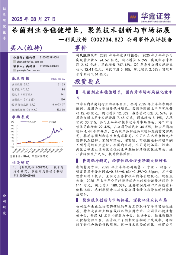 利民股份2025年上半年业绩表现亮眼,杀菌剂业务稳健增长,国内外市场布局持续强化。公司通过技术创新和研发投入,特别是在生物农药领域,不断提升核心竞争力。同时,公司费用控制良好,现金流状况显著改善。维持“买入”投资评级,但需关注需求不及预期、行业政策变化、贸易摩擦、项目进度不确定性以及环保风险等潜在风险。