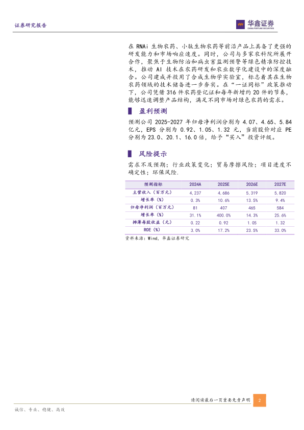 公司近年来在生物农药领域的研发工作取得了多项实质性进展,特别是在微生物合成技术的应用方面。公司依托德彦智创平台,借助AI工具构建算力平台、数据平台、靶标数据库及靶标资源平台,显著提升了创制化合物的开发效率,并缩短了新化合物的筛选周期。这一技术路径的优化,使得公司在RNAi生物农药、小肽生物农药等前沿产品上具备了更强的研发能力和市场响应速度。同时,公司与多家农科院所展开合作,聚焦于生物防治和病虫害监测预警等绿色精准防控技术,推动AI技术在农药研发和农业数字化建设中的深度融合。公司建成并投用了合成生物学实验室,标志着其在生物农药领域的技术储备进一步夯实。在“一证同标”政策推动下,公司凭借316件农药登记证和每年新增约20件的节奏,能够迅速调整产品结构,满足不同市场对绿色农药的需求。