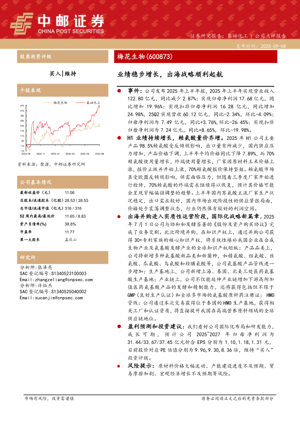 梅花生物2025年上半年业绩稳步增长,赖氨酸业务面临市场动态调整,但整体保持增长态势。公司通过海外并购,在知识产权、产品线、生产基地和产业链上实现了全面升级,国际化战略进入实质性运营阶段。维持“买入”投资评级,但需关注原材料价格波动、产能建设进度、贸易摩擦和宏观经济等风险因素。