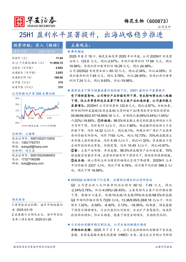 本报告对梅花生物2025年半年度业绩进行了全面分析,指出公司在原料成本下降和销量增加的驱动下,盈利能力显著提升。同时,公司通过并购和海外考察等方式,积极推进全球化战略。报告维持“买入”评级,并提示了市场竞争、原材料价格波动以及海外项目进度等风险。