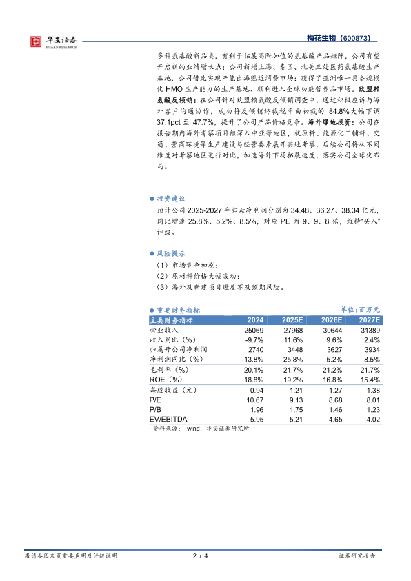 并购协和发酵:2025年7月1日,公司完成收购协和发酵旗下食品氨基酸、医药氨基酸及母乳低聚糖(HMO)业务。通过此次并购公司新增多种氨基酸新品类,有利于拓展高附加值的氨基酸产品矩阵,公司有望开启新的业绩增长点;公司新增上海、泰国、北美三处医药氨基酸生产基地,公司借此实现产能出海贴近消费市场;获得了亚洲唯一具备规模化HMO生产能力的生产基地、顺利进入全球功能营养品市场。欧盟赖氨酸反倾销:在公司针对欧盟赖氨酸反倾销调查中,通过积极应诉与海外客户沟通协作,成功将反倾销终裁税率由初裁的84.8%大幅下调37.1pct至47.7%,提升了公司产品价格竞争。海外绿地投资:公司在报告期内海外考察项目组深入中亚等地区,就原料、能源化工辅料、交通、营商环境等生产建设与经营要素展开实地考察,后续公司将从不同维度对考察地区进行对比,加速海外市场拓展速度,落实公司全球化布局。