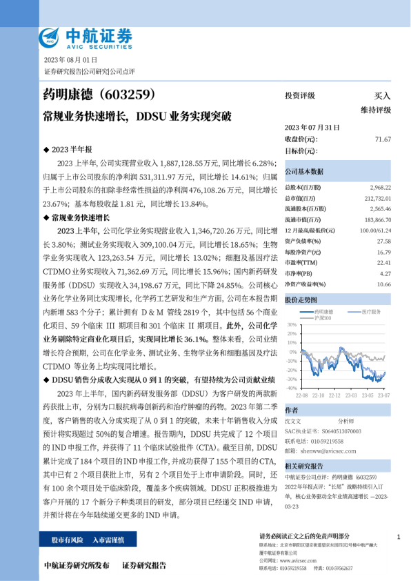 2023上半年,公司化学业务实现营业收入1.346.720.26万元,同比增长3.80%;测试业务实现收入309,100.04万元,同比增长18.65%;生物学业务实现收入123,263.54万元,同比增长13.02%;细胞及基因疗法CTDMO业务实现收入71,362.69万元,同比增长15.96%;国内新药研发服务部(DDSU)实现收入34,198.67万元,同比下降24.85%。公司核心业务化学业务同比实现增长,化学药工艺研发和生产方面,公司在本报告期内新增583个分子;累计拥有D&M管线2819个,其中包括56个商业化项目、59个临床III期项目和301个临床II期项目。此外,公司化学业务剔除特定商业化项日后,实现同比增长36.1%。整体来看,公司业绩增长符合预期,公司在化学业务、测试业务、生物学业务和细胞基因及疗法CTDMO等业务上均实现同比增长。
