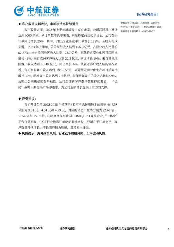 我们预计公司2023-2025年摊薄后(暂不考虑转增股本的影响)的EPS分别为3.31元、4.04元和4.99元,对应的动态市盈率分别为22.68倍、18.54倍和15.02倍。药明康德作为我国CDMO/CRO龙头企业,“一体化”平台优势明显,CXO行业依靠订单驱动业绩增长,公司在手订单充足,客户数量持续增长,增长态势较为明确,维持买入评级。