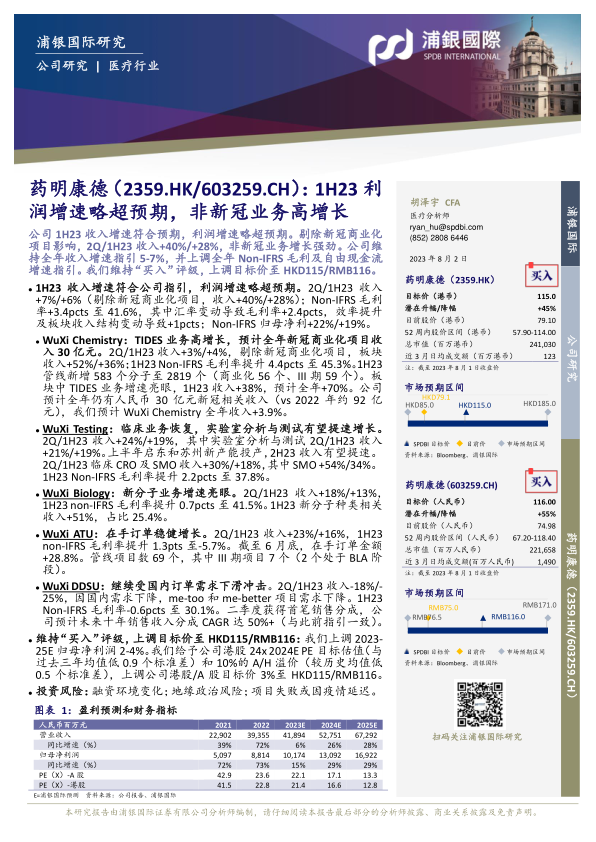 公司1H23收入增速符合预期,利润增速略超预期。剔除新冠商业化项目影响,2Q/1H23收入+40%/+28%,非新冠业务增长强劲。公司维持全年收入增速指引5-7%,并上调全年Non-IFRS毛利及自由现金流增速指引。我们维持“买入”评级,上调目标价至HKD115/RMB116。