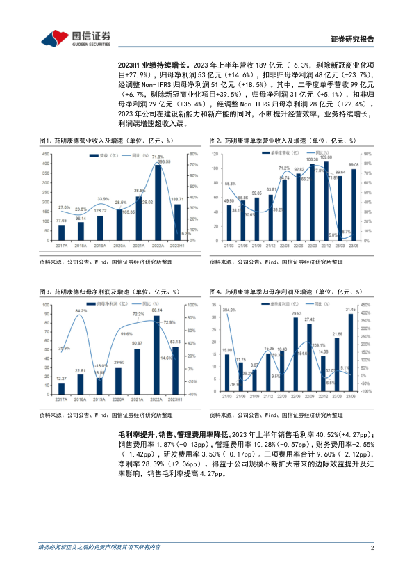 2023H1 业绩稳步增长。 2023 年上半年营收 189 亿元(+6.3%, 剔除新冠商业化项目+27.9%) , 归母净利润 53 亿元(+14.6%) , 扣非归母净利润 48 亿元(+23.7%) , 经调整 Non-IFRS 归母净利润 51 亿元(+18.5%) 。 其中, 二季度单季营收 99 亿元(+6.7%, 剔除新冠商业化项目+39.5%) , 归母净利润31 亿元(+5.1%) , 扣非归母净利润 29 亿元(+35.4%) , 经调整 Non-IFRS归母净利润 28 亿元(+22.4%) 。 2023 年公司在建设新能力和新产能的同时,不断提升经营效率, 业务持续增长, 利润端增速超收入端。