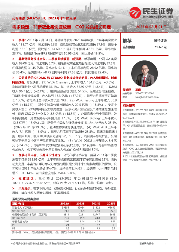 2023年半年报点评:需求稳定,非新冠业务快速放量,CXO龙头成长确定