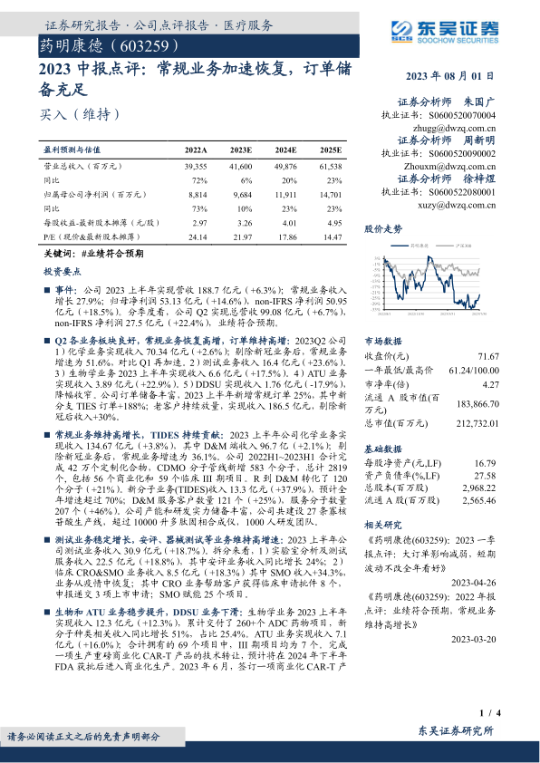 本报告对药明康德2023年中报进行了详细分析,公司业绩符合预期,常规业务加速恢复,订单储备充足,各业务板块均呈现良好增长态势。公司作为CRO平台化龙头,凭借其强大的研发实力和丰富的产能储备,有望在未来继续保持领先地位。维持“买入”评级,但需关注行业增速放缓、竞争加剧以及产能过剩等风险。