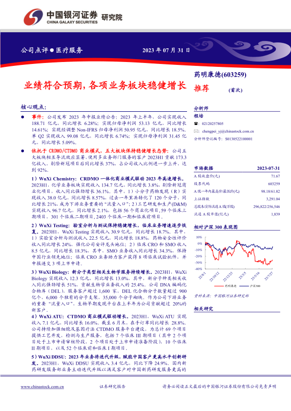 2)WuXiTesting:验室分析与测试保持稳健增长,临床业务增速逐步恢复。2023H1,WuXiTesting实现收入30.9亿元,同比增长18.7%。其中,1)实验室分析与测试收入22.5亿元,同比增长18.8%,药物安全性评价收入同比增长24%,强化公司安评龙头地位;2)临床CRO和SMO收入8.5亿元,同比增长18.3%,其中,SMO业务收入同比增长34.3%,保持中国行业领先地位;临床CRO业务助力客户获得8项临床试验批件,并申报递交3项上市申请。