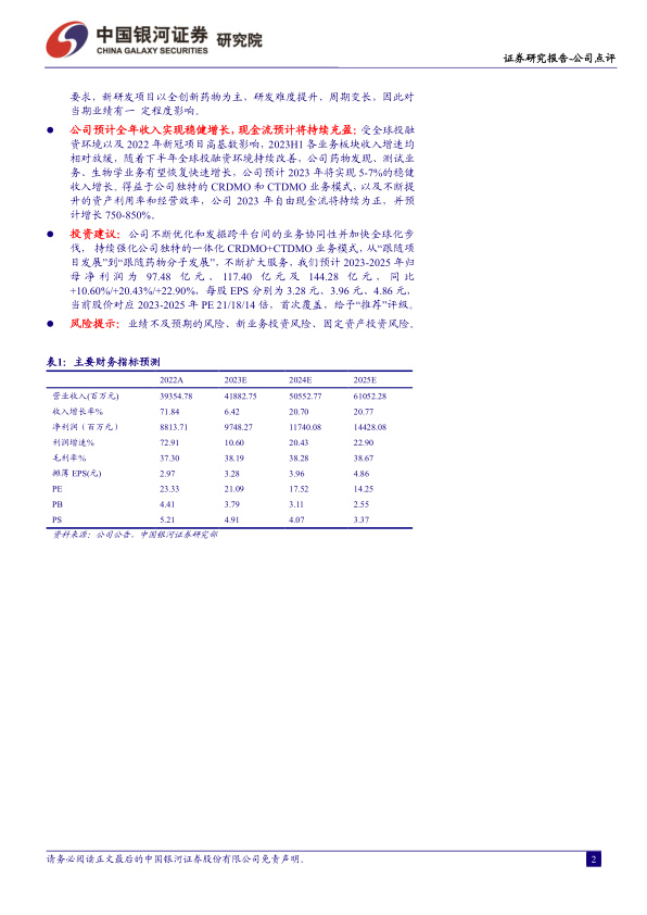 投资建议:公司不断优化和发掘跨平台间的业务协同性并加快全球化步伐,持续强化公司独特的一体化CRDMO+CTDMO业务模式,从“跟随项目发展”到“跟随药物分子发展”,不断扩大服务,我们预计2023-2025年归母净利润为97.48亿元、117.40亿元及144.28亿元,同比+10.60%/+20.43%/+22.90%,每股EPS分别为3.28元、3.96元、4.86元,当前股价对应2023-2025年PE21/18/14倍,首次覆盖,给予“推荐”评级。